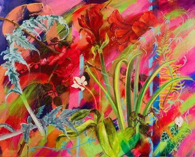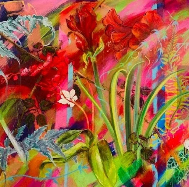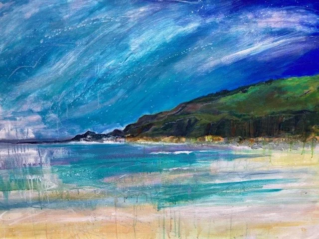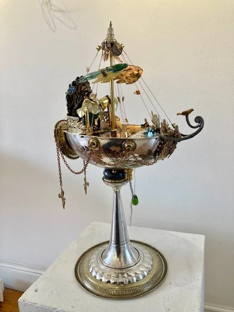 Bold, colourful paintings of sea and land plus bright acrylics of blooms surrounded with intricate patterns. Intriguing metal sculptures from recycled silver plate.