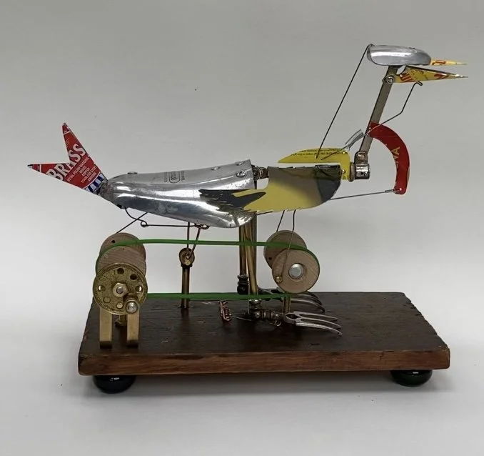 Wick makes automata, fantastical recycled metal electric lamps, peewit oil lamps, candlesticks, postcard holders and anything else he fancies!